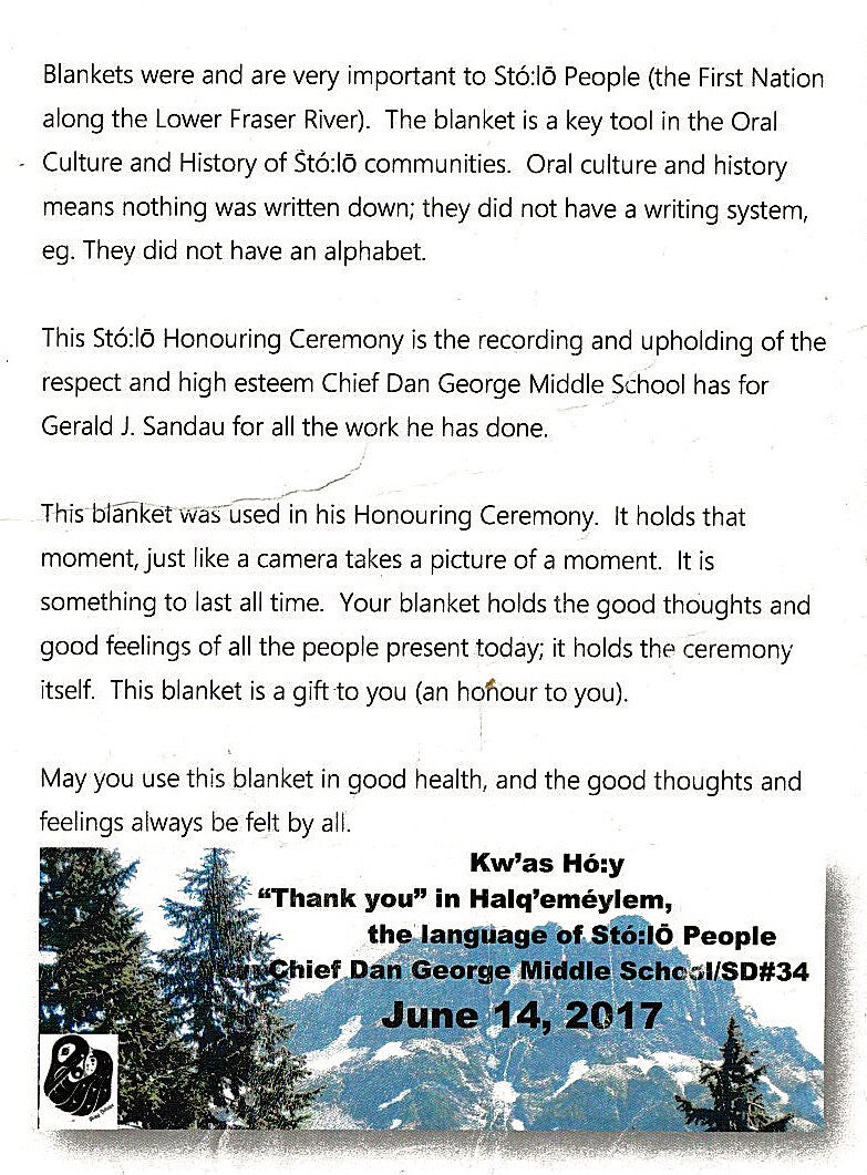 On the 14 of June 2017 the Chief Dan George Middle School in Abbotsford BC, in a full school assembly, had an Traditional Sto:lo Honor Ceremony to honor the Fraser Valley Lodge for the donation of a stone Sculpture of Chief Dan George and the artist Gerald Sandau of Chilliwack for making it. The ceremony was complete with First Nations drummers, singers and speakers, including a Band Chief from Mission, who personally knew Dan George.