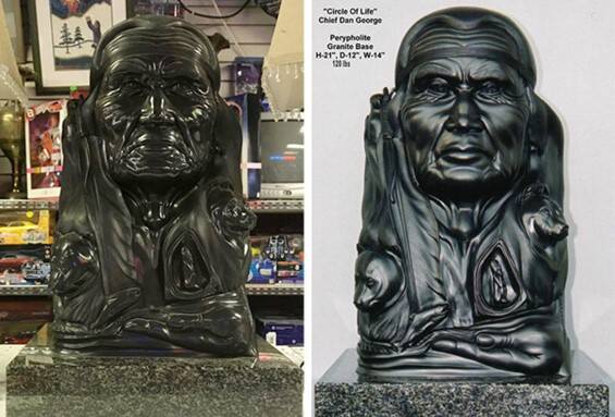 Charges have now been laid in the theft of a sculpture of Chief Dan George from the Chief Dan George Middle School in Abbotsford BC and its sale to a Mission pawn shop. The Man was charged Friday (Sept. 13 Sep. 2019 ) with theft over $5,000, according to the provincial court database. He is scheduled to make his first appearance in Abbotsford provincial court on Oct. 21. The date of the offence is listed as July 2, 2018. The one-of-a-kind sculpture – valued at $8,000 – was made by artist Gerald Sandau of Chilliwack and was purchased by Fraser River Lodge in Agassiz. The lodge, in turn, donated the piece to Chief Dan George Middle School in Abbotsford, B.C. in 2017. But when Sandau visited the school on June 26 ,2019, he noticed it was missing from its display case. He then found out that the sculpture had been moved into storage because the multi-purpose room close to where it was being displayed was undergoing renovations. But a search of the school, storage and school grounds after Sandau questioned its disappearance failed to turn up the piece. Sandau approached Abbotsford News Reporter Patric Penner with the story. School officials filed a police report on July 4. Following news reports on the matter, including pictures of the missing sculpture, a man reported on social media that he had seen the item in the Mission City Pawn Shop. Police went to the location and retrieved the piece. The owner of the pawn shop later told the Abbotsford News that he had purchased the item a year earlier – on July 20, 2018 – for $1,000. He said he had no idea the artwork was stolen. – wit The Abbotsford News files from Patrick Penner